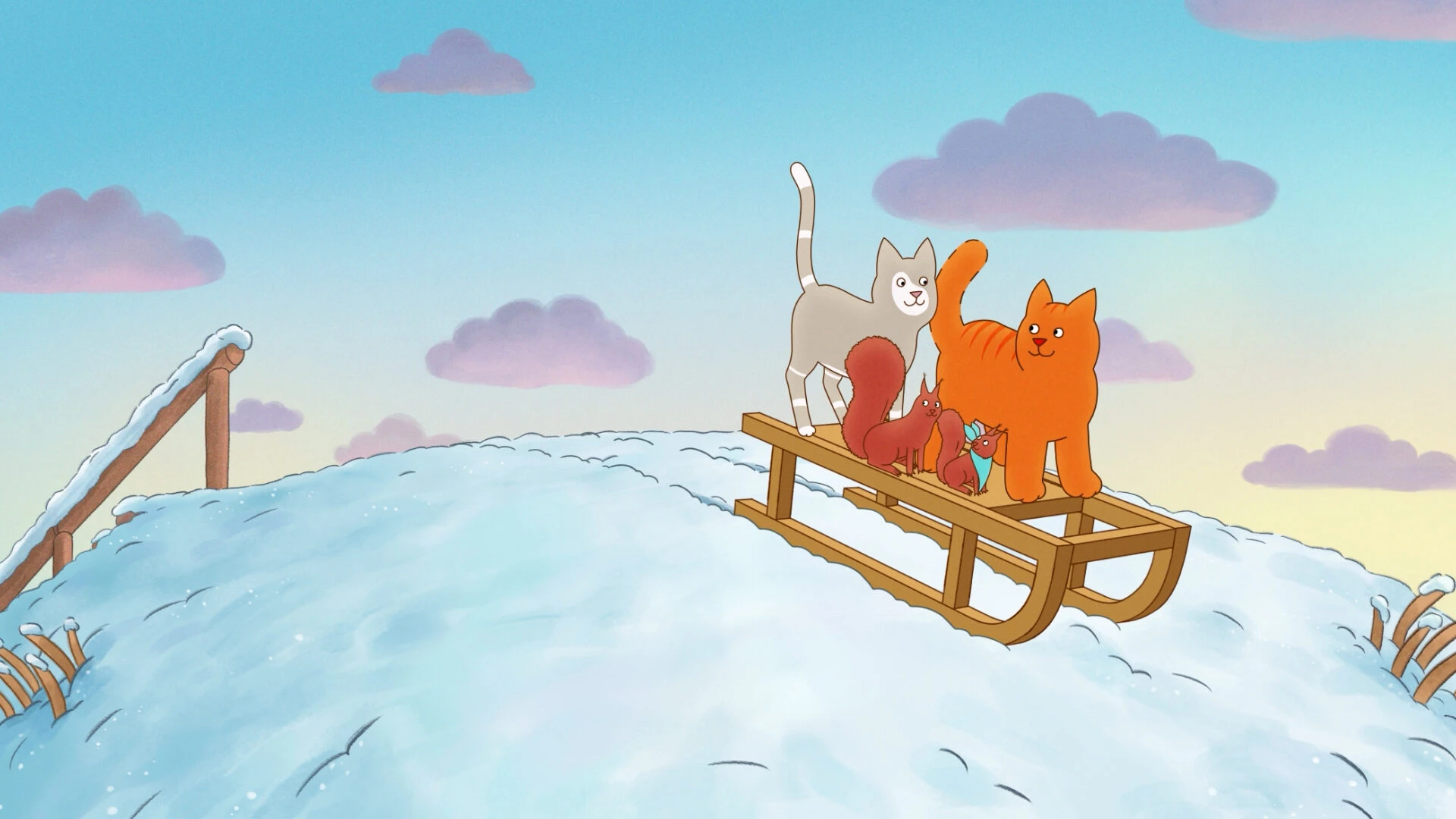 Tomi Tom on reipas oranssi kissa, joka pitää seikkailuista. Eräänä aamuna sen paras ystävä, harmaa kissa nimeltä Hiironen tulee pyytämään sen kanssaan ulos. Yöllä on tullut lunta, ja lumi tietää lumileikkejä! Leikittyään hetken pihalla ystävykset löytävät jotain jännittävää: puisen kelkan! Kissat päättävät lähteä kohti rantaa, missä on mäenlaskuun sopivia hiekkadyynejä. Matkalla kohdataan myös uusia ja vanhoja tuttavuuksia: ankkoja, lampaita, jäniksiä ja oravia. Mukaan pyrkii myös yllättävä kaveri: naapurin uusi koira. Koira on iso, äänekäs ja temmeltää villisti. Hiironen pelkää sitä. Lumipyry voi kuitenkin muuttaa kaiken. Koirasta paljastuu aivan uusia, yllättäviä puolia. Elokuva sopii hyvin esikouluikäisille, sillä nyt saa puhua, tanssia ja laulaa mukana!